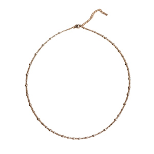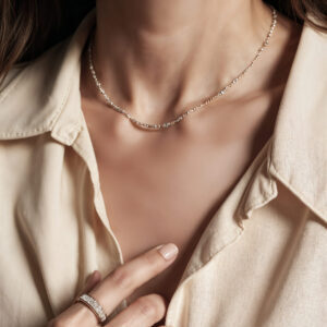 胸元に、こぼれ落ちる星の瞬きを。繊細なシルバーチェーンに、小さなビーズを等間隔にあしらったステーションネックレス。光の粒が肌の上で踊るような、軽やかでリズミカルな輝きが魅力です。一見するとシンプルなラインに見えますが、 動くたびにビーズがランダムに光を反射し、顔周りをパッと明るく華やかに彩ります。 空気のように軽い着け心地で、朝から夜まで、あなたの日常にそっと寄り添います。