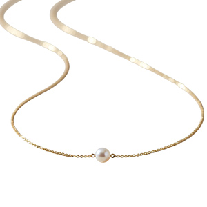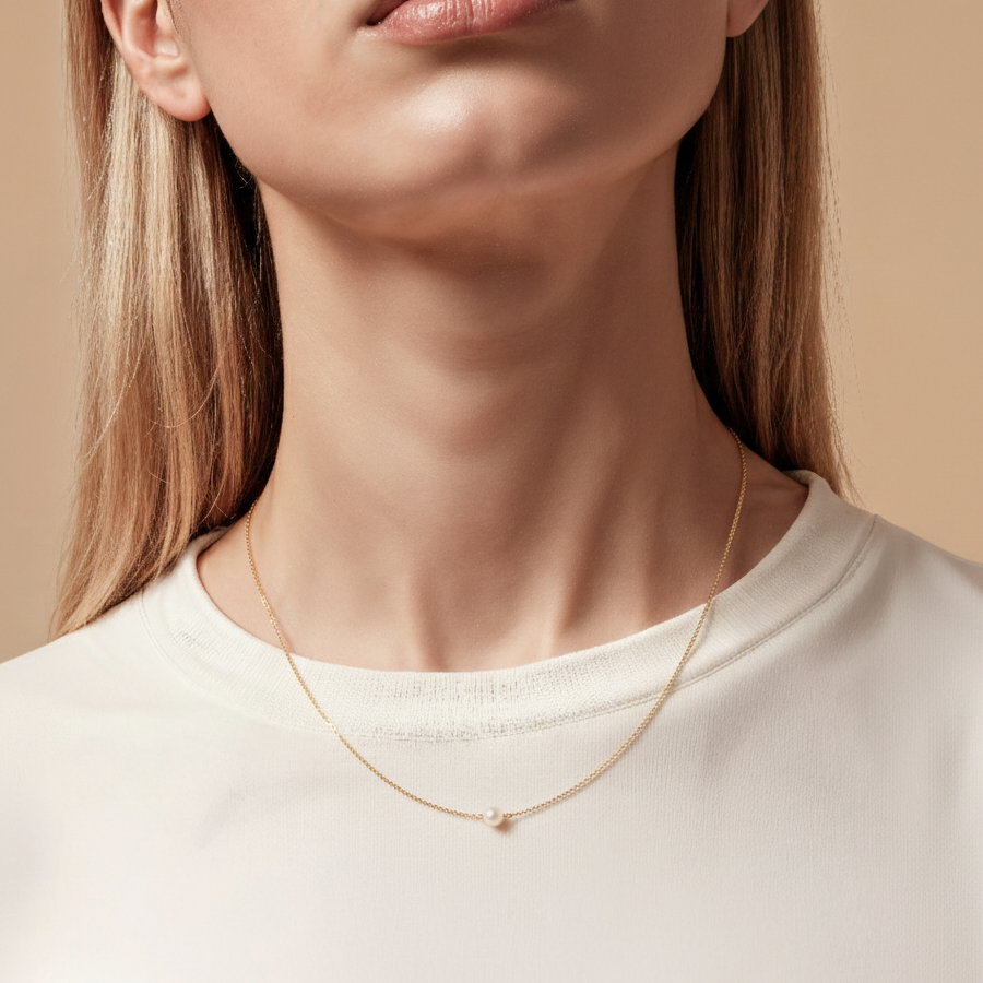 一粒の淡水パールを、K18チェーンで繊細に仕立てたミニマルネックレス。控えめでありながら、確かな品格を感じさせる一本。光を受けてやわらかく艶めくパールが、首元に自然な明るさを添えます。