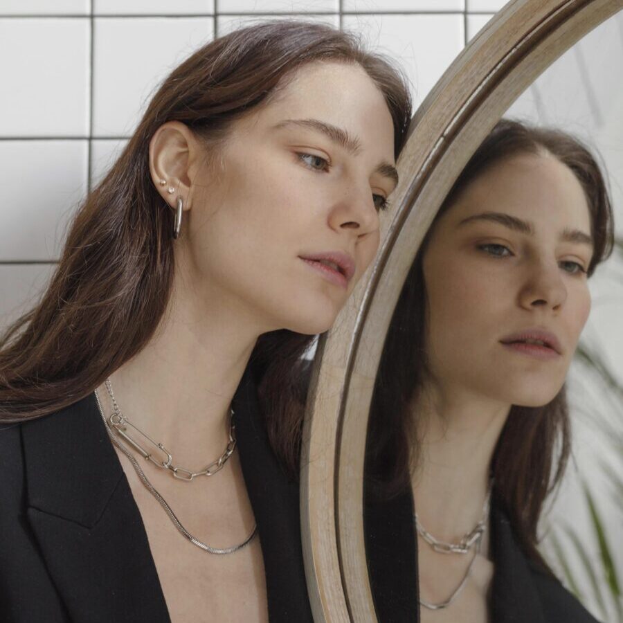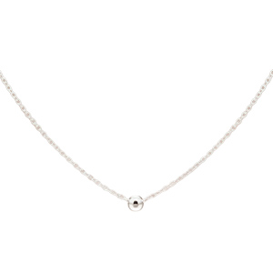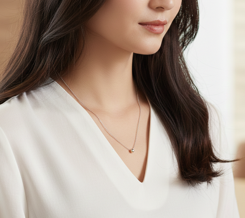 ただ一点、潔い光をデコルテに。極細のシルバーチェーンの中央に、鏡面仕上げのビーズを一粒だけあしらったミニマルネックレス。 余計な装飾をすべて削ぎ落とした、究極の「引き算」から生まれた一本です。ミラーボールのように光を反射する小さな一粒が、 視線を中央に集め、顔周りをすっきりと知的な印象に導きます。 どんなにカジュアルな日常着でも、これを一筋通すだけで、 着こなしに「芯」が通り、洗練された大人の佇まいへと変わります。