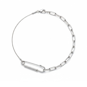 異なる個性が響き合う、現代的な調和。繊細なアズキチェーンと、無骨なオーバルリンクをアシンメトリーに繋ぎ合わせたコンビネーションネックレス。 「相反する要素の共存」をテーマにした、遊び心あふれる一本です。アクセントとして配されたセーフティピン(安全ピン)モチーフが、 クリーンなシルバーの輝きに、ほどよいストリート感とモードな表情をプラスします。 見る角度によって印象を変えるデザインは、 シンプルな装いに一点投入するだけで、今の空気感を纏わせてくれます。