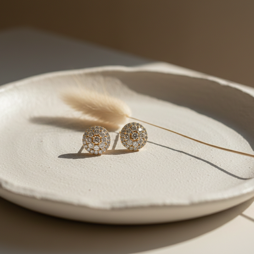 日常を贅沢に変える、最小で最大の輝き。 「本物の素材を、もっと身近に。」というブランドの想いを象徴する、K18×天然ダイヤモンドのスタッドピアス。 繊細なパヴェセッティングにより、ダイヤモンドがひとつの大きな光の粒のように輝くよう設計されています。18金ならではの深い黄金色と、天然石にしか出せない強い煌めきが、横顔をドラマチックに演出します。
