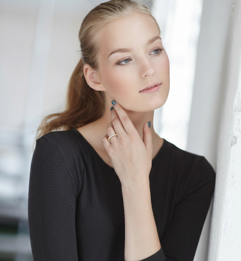 途切れることのない輝きが、日常を祝福する。 リングの全周(または半周)にわたって、厳選されたストーンが贅沢に並ぶエタニティリング。 地金の露出を最小限に抑えたセッティングにより、光を全方向から取り込み、溢れ出すような煌めきを放ちます。 18金ゴールドの温かみのある光沢がストーンの輝きと共鳴し、手元を華やかに、そしてドラマチックに演出。 単体での美しさはもちろん、他のリングとのレイヤードでさらに輝きが深まる、タイムレスなマスターピースです。