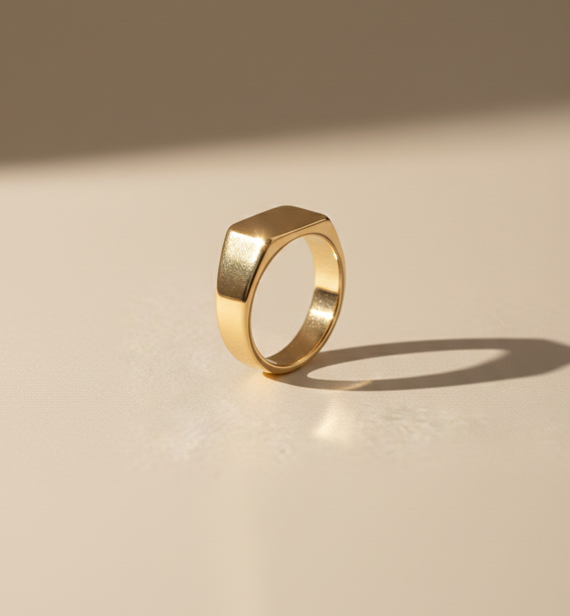 揺るぎない個性を、黄金の輝きに託して。 シャープな面構成がモダンな印象を放つ、K18ゴールドのシグネットリング。 地金の美しさを最大限に引き出すため、あえて装飾を削ぎ落としたミニマルな一品。 鏡面のように丹念に磨き上げられたトップが光を直線的に跳ね返し、手元に力強くも洗練されたエッジを添えます。 18金ならではの重厚な光沢と、指に馴染む滑らかなフォルムが、日常のスタイルに揺るぎない自信と品格をもたらします。