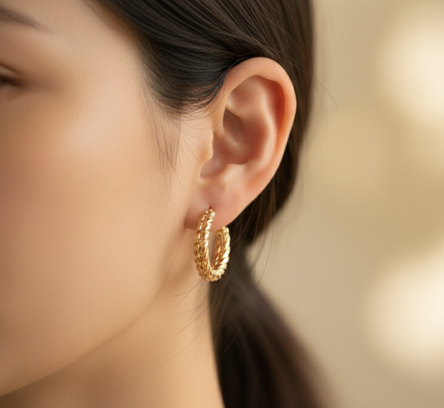 素肌に溶け込む、本物の輝きを纏う。一生モノの「18金」を日常に取り入れたい方への最適解。 繊細な細さに仕上げることで、K18ならではの濃密な黄金色の美しさを際立たせたフープピアスです。本物のゴールドだけが持つ、時間が経っても色褪せない輝きが、顔まわりに確かな品格を添えます。ミニマルなデザインだからこそ、素材の良さがストレートに伝わる、大人のためのエッセンシャルな一品です。
