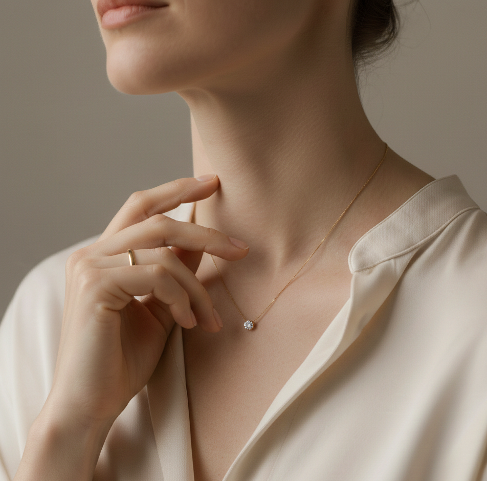ただ一つ、永遠に色褪せない光を。繊細なK18チェーンの先に、一粒の輝きを静かに宿したソリティアネックレス。身に纏う人の内なる輝きを、最も美しく引き出すための正統派な一本です。極小の爪で留められた石が、あらゆる角度からの光を取り込み、 デコルテにダイヤモンド特有の、気高くも繊細な瞬きを添えます。 トレンドに左右されないその姿は、 時を重ねても変わらず、あなたの日常を照らし続けるパートナーとなります。