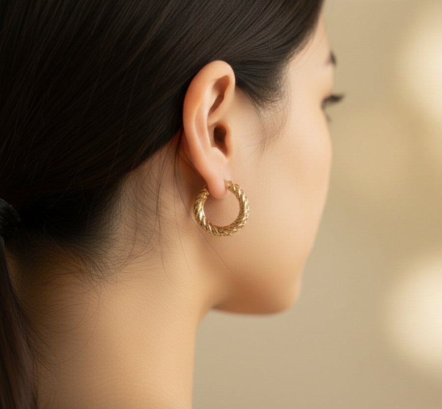 素材・サイズ素材:K18 Gold デザイン:ツイスト フープ直径:約15mm ポスト:キャッチレス(遮断式)